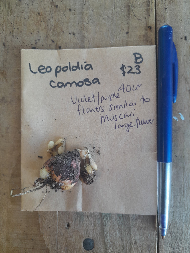 (syn. Muscari comosum). Like a giant muscari with a tasselled top.  Starts dark violet with flowers eventually turning a cream and brown combo. Pretty and unusual. Choose a well drained, sunny spot. 40cm